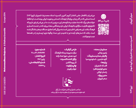 دانلود آلبوم محمد رضا شجریان به نام سر در گریبان Mohammad Reza Shajarian – Sar Dar Gariban تاریخ : 21 دسامبر 2025 تعداد دانلود : 1,392 صفحه نخست دانلود آلبوم محمد رضا شجریان دانلود آلبوم محمد رضا شجریان به نام سر در گریبان دانلود یکجا با کیفیت MP3 320 # پخش نام قطعه پلی لیست کیفیت MP3 320 ترانه 1 Rhythmic Prelude (10-Beat) 2 Vocal & Instrumental - Dashti 3 Tasnif-e Nemidanam 4 Santur, Tondar, Tombak Trio 5 Tasnif-e Sar Dar Gariban 6 Vocal & Instrumental - Bayat_e Tork 7 Omid Piece 8 Vocal & Instrumental Kamancheh, Saghar 9 Tasnif_e Modara Nakoni بستن 00:00 00:00 کاور های آلبوم آهنگ های بیشتر از محمد رضا شجریان نظرات ارسال نظر نظر فرزانه در تاریخ : دسامبر 23, 2025 استاد الاساتید نظر سیاوش در تاریخ : دسامبر 23, 2025 بسیار عالی. سپاس از موزیک باران نظر kian در تاریخ : دسامبر 25, 2025 بینظیر .یادش گرمی باد ورود عضویت موزیک باران آهنگ آلبوم موزیک ویدیو انجمن تماس با ما پس از تایپ دکمه اینتر را بفشارید نام کاربری کلمه عبور کلمه عبورم را فراموش کردم ! نام و نام خانوادگی ایمیل نام کاربری کلمه عبور تکرار کلمه عبور کلمه عبورم را فراموش کردم !